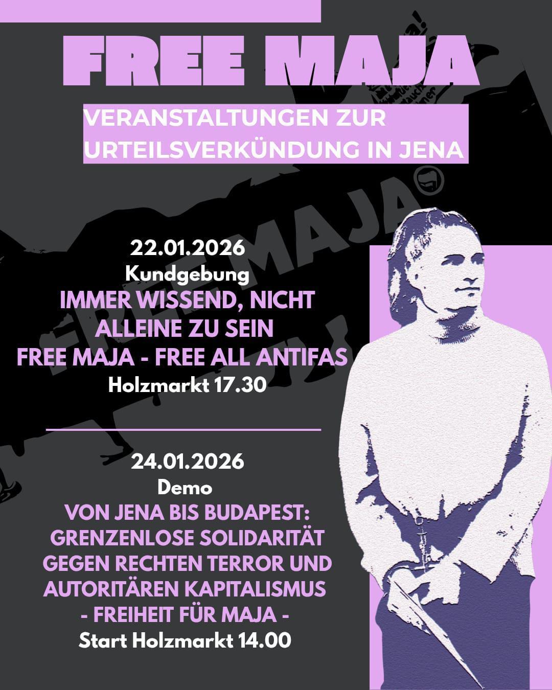 Am 22. Januar soll in Budapest das Urteil gegen Maja gesprochen werden. Es drohen bis zu 24 Jahre Haft. Wir nehmen das nicht unwidersprochen hin. Kommt zur Kundgebung am Tag der Urteilsverkündung am 22.01.2026, 17:30 Uhr auf den Holzmarkt in Jena und am 24.01.2026, 14 Uhr zur Demonstration ab Holzmarkt, Jena.